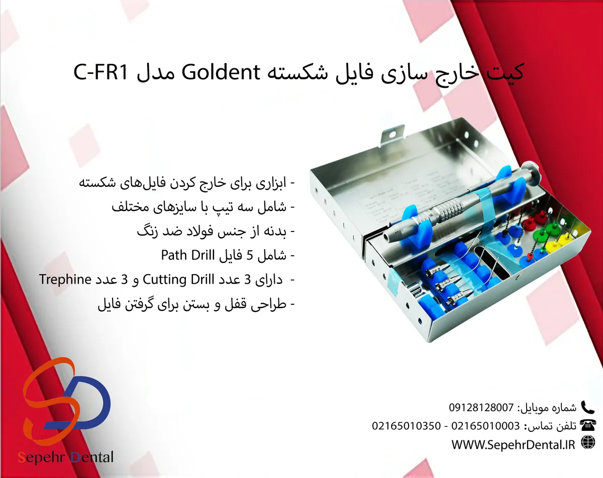 - دارای 5 فایل Path Drill ، و 3 تیپ Cutting Drill و 3 تیپ Trephine ضد زنگ و ضد فرسودگی